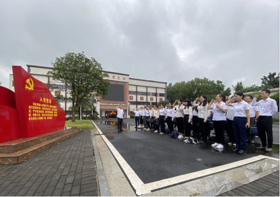 在陳列館前,頂著細(xì)雨,面對著鮮紅的黨旗,四區(qū)中青干班學(xué)員重溫了入黨誓詞,鏗鏘有力的宣誓聲響徹廣場。