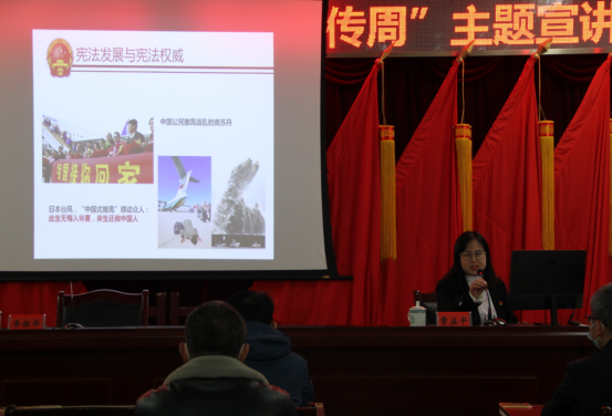 曹益平采取“以案釋法”、“釋法說理”的方式,從憲法的發(fā)展歷史、2018年憲法修正案內(nèi)容的解讀以及憲法權威的樹立三個方面講授憲法內(nèi)容,闡釋憲法精神。2022年正值現(xiàn)行憲法(1982年憲法)公布實施四十周年,宣講強調(diào)憲法的根基在于人民發(fā)自內(nèi)心的擁護,憲法的偉力在于人民出自真誠的信仰,要從弘揚社會主義核心價值觀、落實憲法宣誓制度、完善監(jiān)察制度等方面踐行憲法。